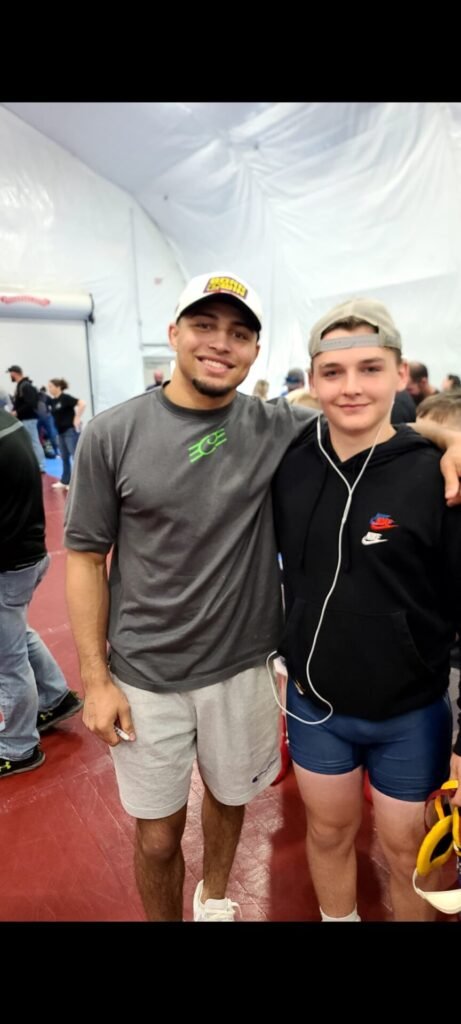 Anthony Ausherman meets with North Hagerstown High School alumnus and NCAA national champion wrestler Aaron Brooks. PROVIDED PHOTO