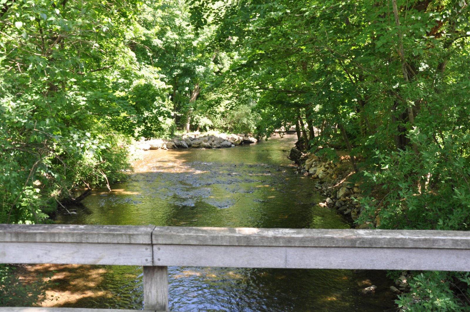When you arrive at the bridge traversing the East Branch of the Antietam Creek, if you look right, you see the bridge crossing the same creek along Route 16 (Buchanan Trail). If you look left, you see trees, rocks and water.