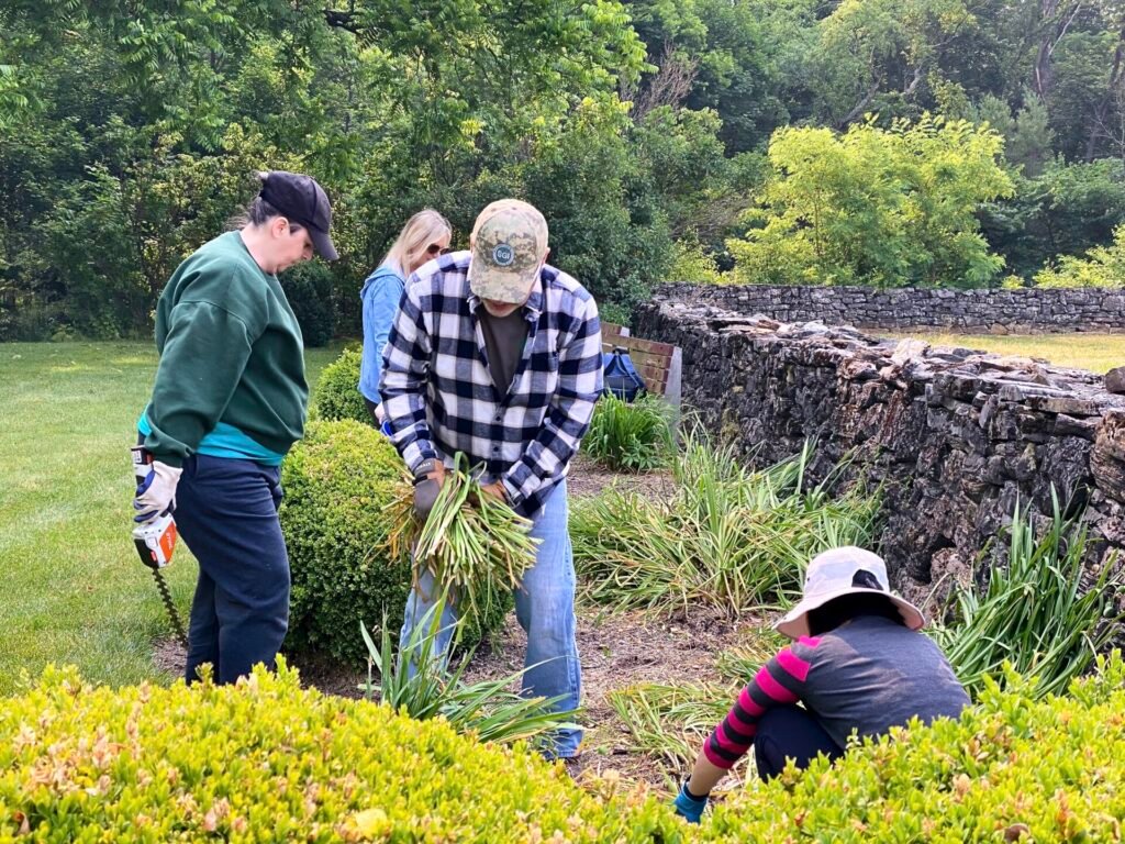 Volunteers split into two groups to continue the efforts they began in late April at the 107-acre historic farmstead. One group focused on additional weeding needed in the site’s flower beds, pruned shrubs, and mulched. The other group continued efforts to clear excess brush, twigs, fallen limbs, trees, and trunks around the site’s creek beds and walking trails.
