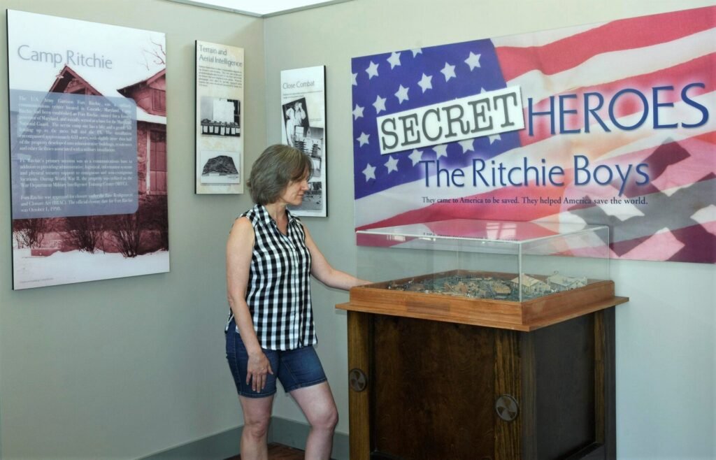 During the World War II period (1941-45), German and Italian POW’s arrived at Ritchie and the Federal government initiated a critical new mission. A Military Intelligence Training Center was activated in June, 1942. Among the 20,000 troops trained at Camp Ritchie, some had high fluency in European languages and cultural customs. Many were Jewish refugees born in Germany and Austria.