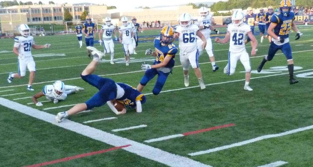 The playmaker of the second half was Benedict’s replacement at fullback, freshman Anthony Ausherman. Ausherman introduced himself to the Spring Grove defense by reeling off a 19-yard run on his first carry.He burrowed his way for another nine yards, then six more to push the ball to the Spring Grove 30 yard line. Myers pulled in an 11-yarder on a second-down play and then extended himself and made the catch for 18 yards.