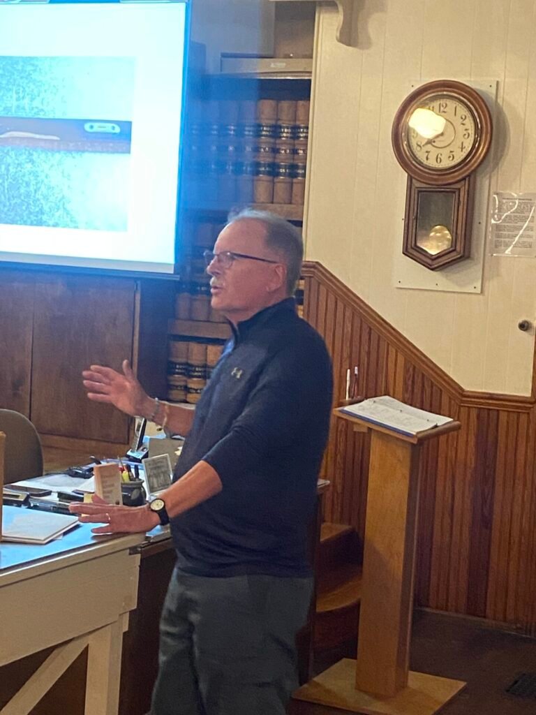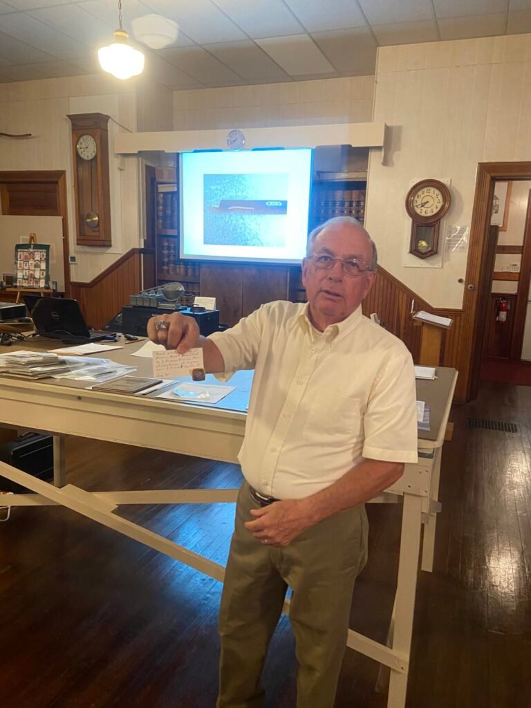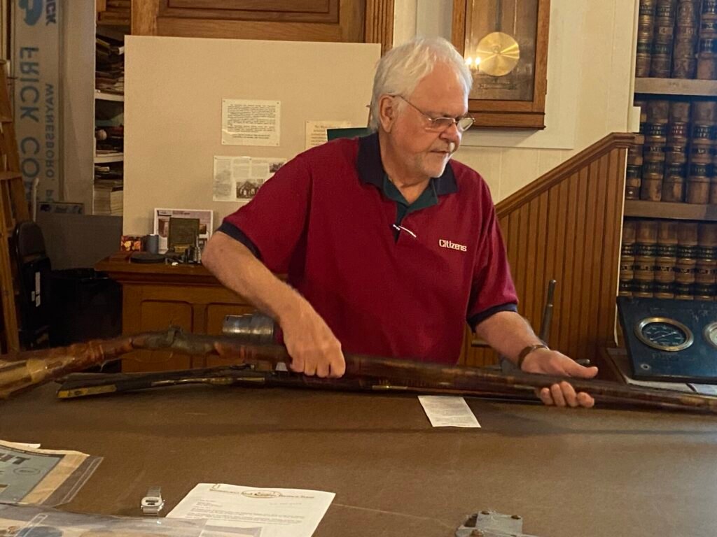 Wayne Bartholow talked about his J.H. Johnston rifles. Johnston was a Waynesboro gunsmith. V. Brian Shook, president of the museum’s board of directors, presented several recent donations, including a pin from the 50th anniversary of Grove Manufacturing Co.