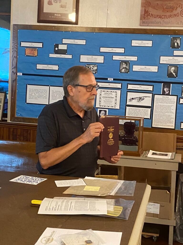 Terry Flegel showed those attending a Frick Co. operator’s manual on how to build refrigeration equipment, autographed by President A.O. Frick, from 1896, as well as the annual statement of the board of directors of Frick Co. from 1885, listing assets of more than $1.3 million, which today would be a little less than $44 million, according to Fleagle.