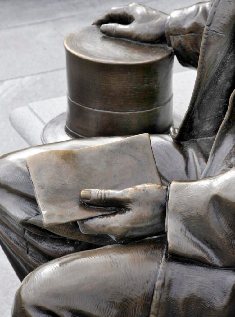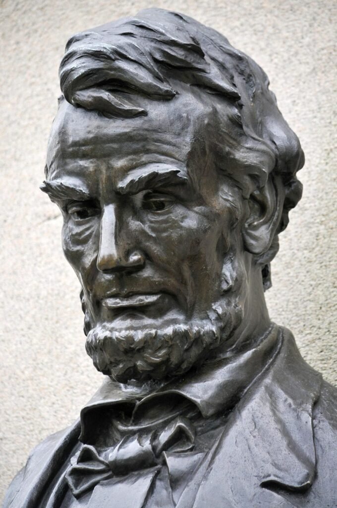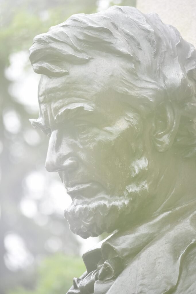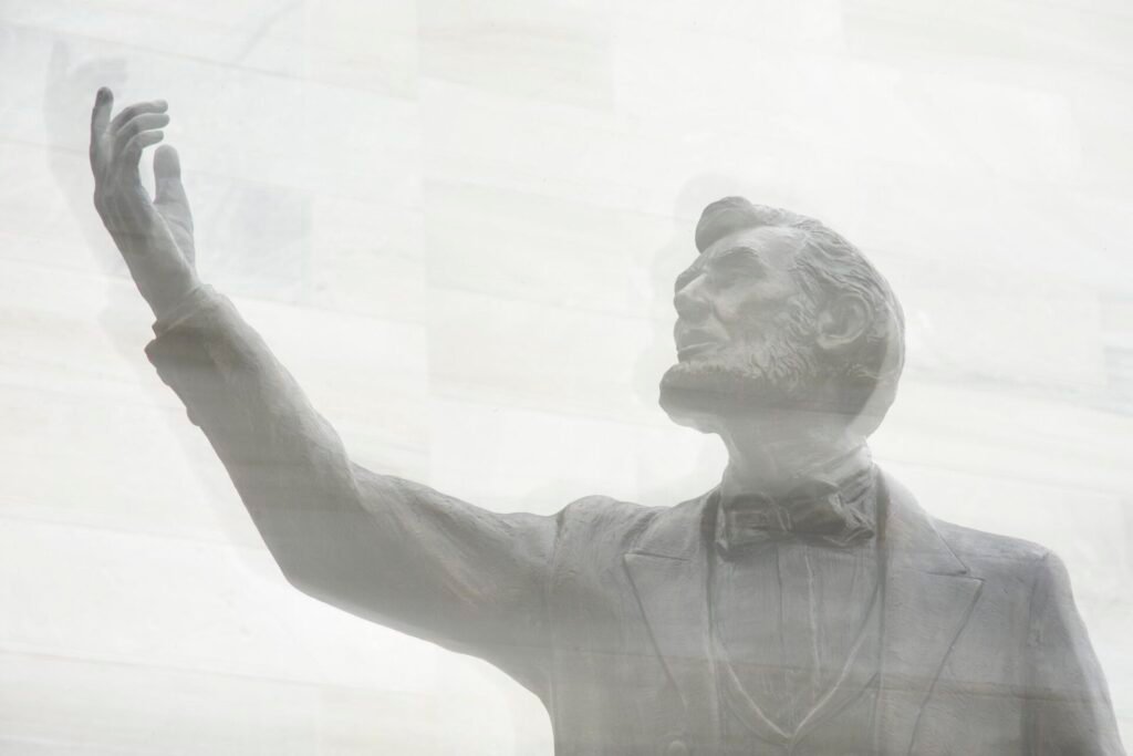 Monuments celebrating Lincoln’s leadership are spread throughout Gettysburg. A bronze bust of him is located near the site of his famous speech; another more animated figure of Abe is placed in front of the post office. At the National Park Visitors Center, a pensive Lincoln holds his iconic text with signature stovepipe hat placed at his side. Another whimsical statue has lanky Abe greeting a modern tourist on Gettysburg’s town square.
