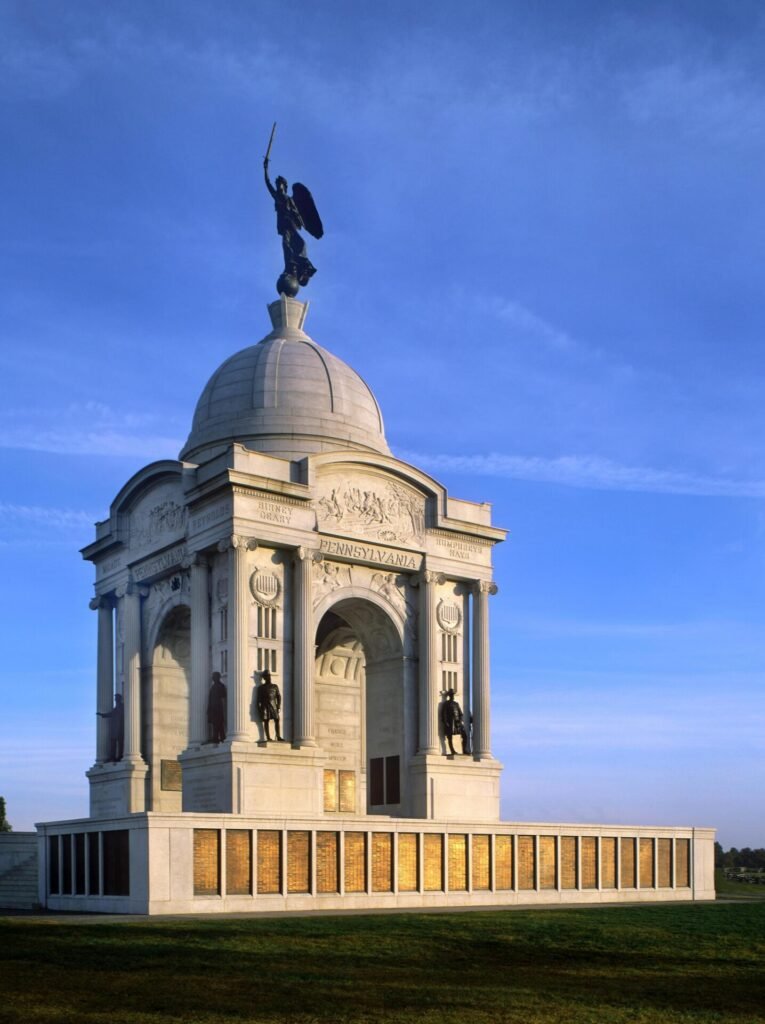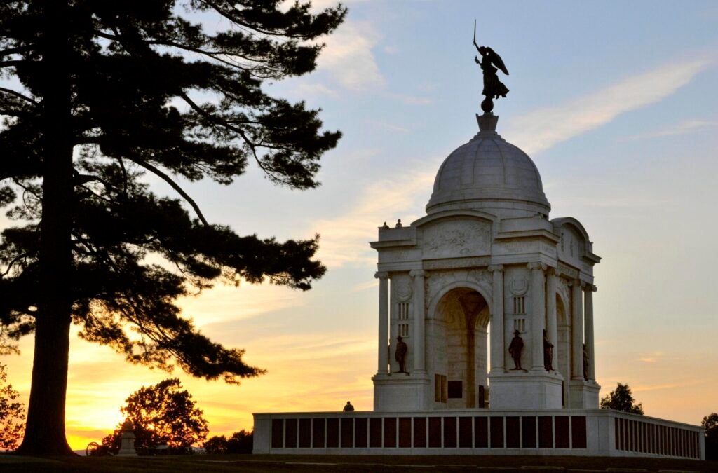 The most impressive monument on the battleground is fittingly the State of Pennsylvania Memorial. This 110-foot-tall granite structure is an architectural wonder, visible from points all over the battlefield. Friezes and statues decorate each side and a 500-pound “Goddess of Victory and Peace” statue, made from melted Civil War cannons, adorns the top. Completed in 1914, the monument commemorates the 34,000 Pennsylvania soldiers who fought at Gettysburg. A spiral staircase leads to the roof so visitors can enjoy an elevated 360-degree view.