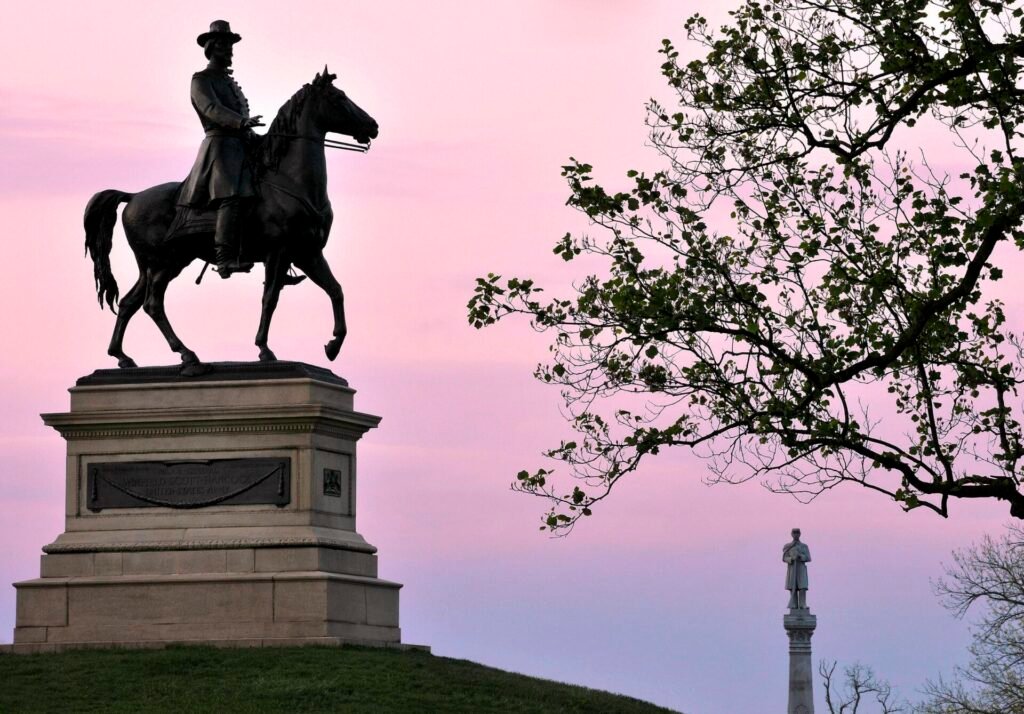One past Union leader remembered in bronze was General Winfield Scott Hancock. His stately equestrian statue commands Cemetery Hill. Wounded during the battle, Hancock survived his injury. According to a popular myth, a rider like Hancock, whose horse stands with one hoof off the ground, symbolizes his type of casualty. If a faux horse has two legs airborne instead, then the rider died, if none, the lucky soldier was uninjured.