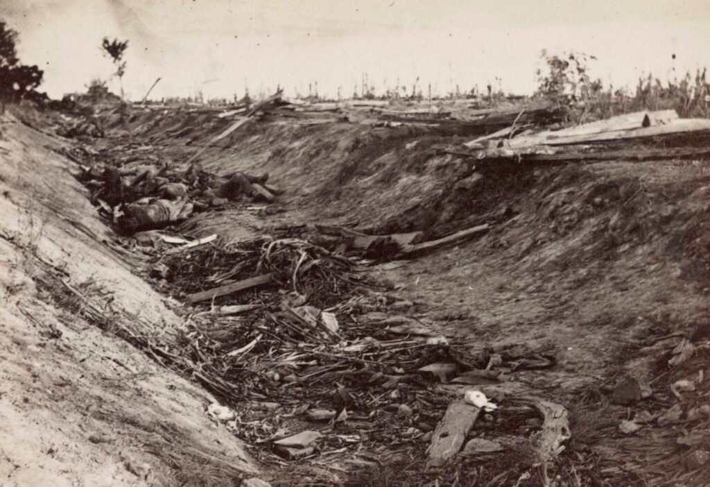 Long shutter exposures were a necessity during that period, requiring subjects to stay perfectly still for as long as fifteen seconds. Some sitters weren’t patient, and their resulting movement caused the common ghostlike blurred appearance seen in many old photographs. Long exposure times also made photographing battle action nearly impossible. But Mathew Brady realized one photographic subject never moved: dead bodies.