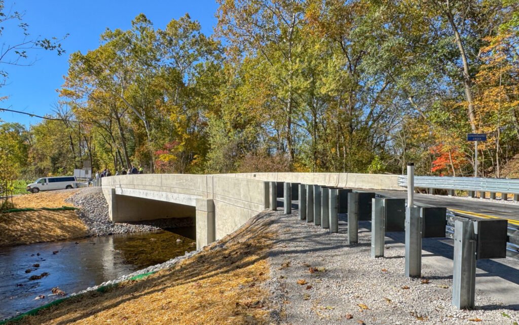 The new bridge replaces the previous single-lane structure with a double-lane, single-span non-composite prestressed concrete bridge that measures 55 feet, 6 inches long and 28 feet, 4 inches wide. The new bridge also addresses structural deficiencies and eliminates the weight restrictions imposed on the former structure, originally built in 1963 and reconstructed in 1990. Construction on this project began in June and was completed in early October.